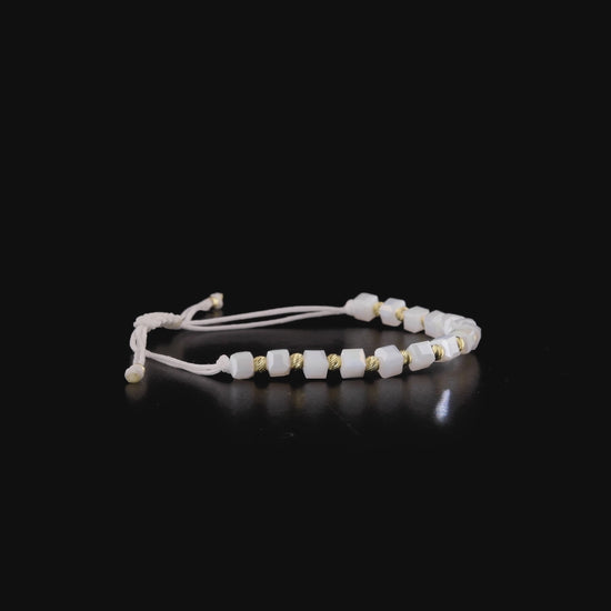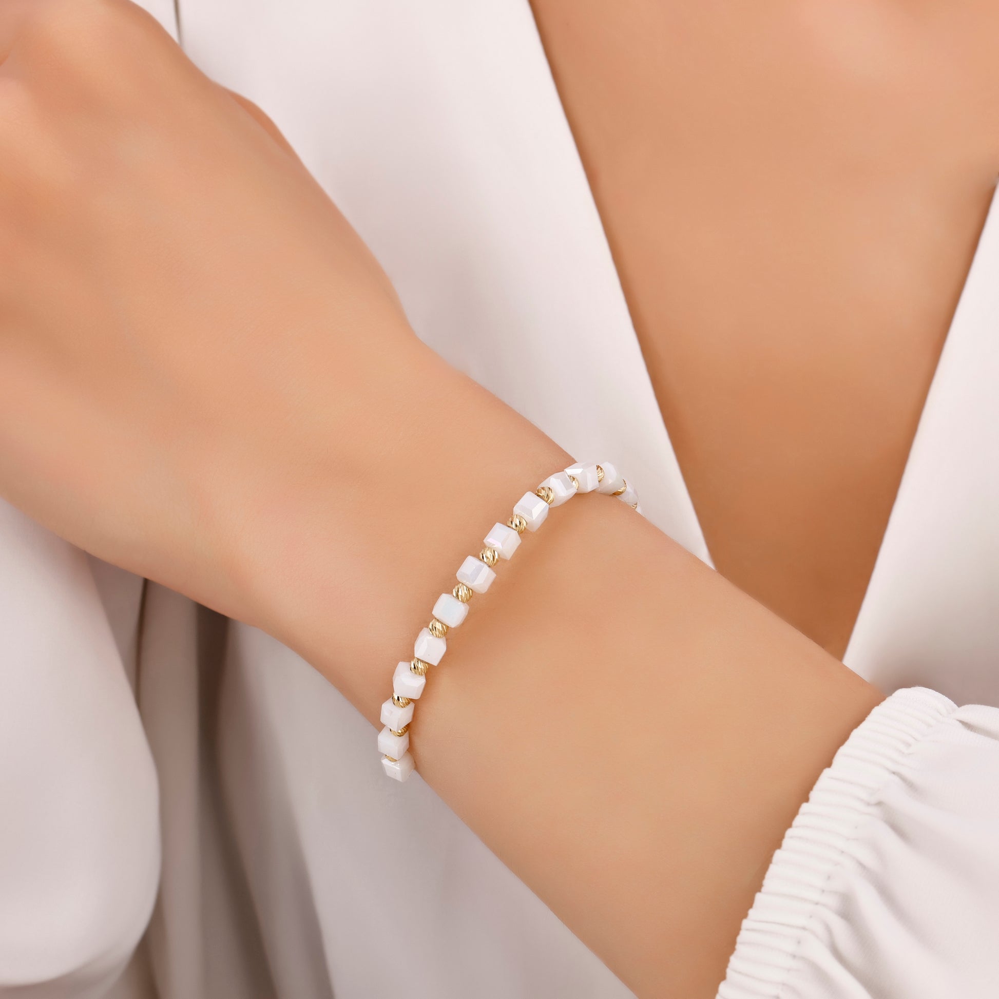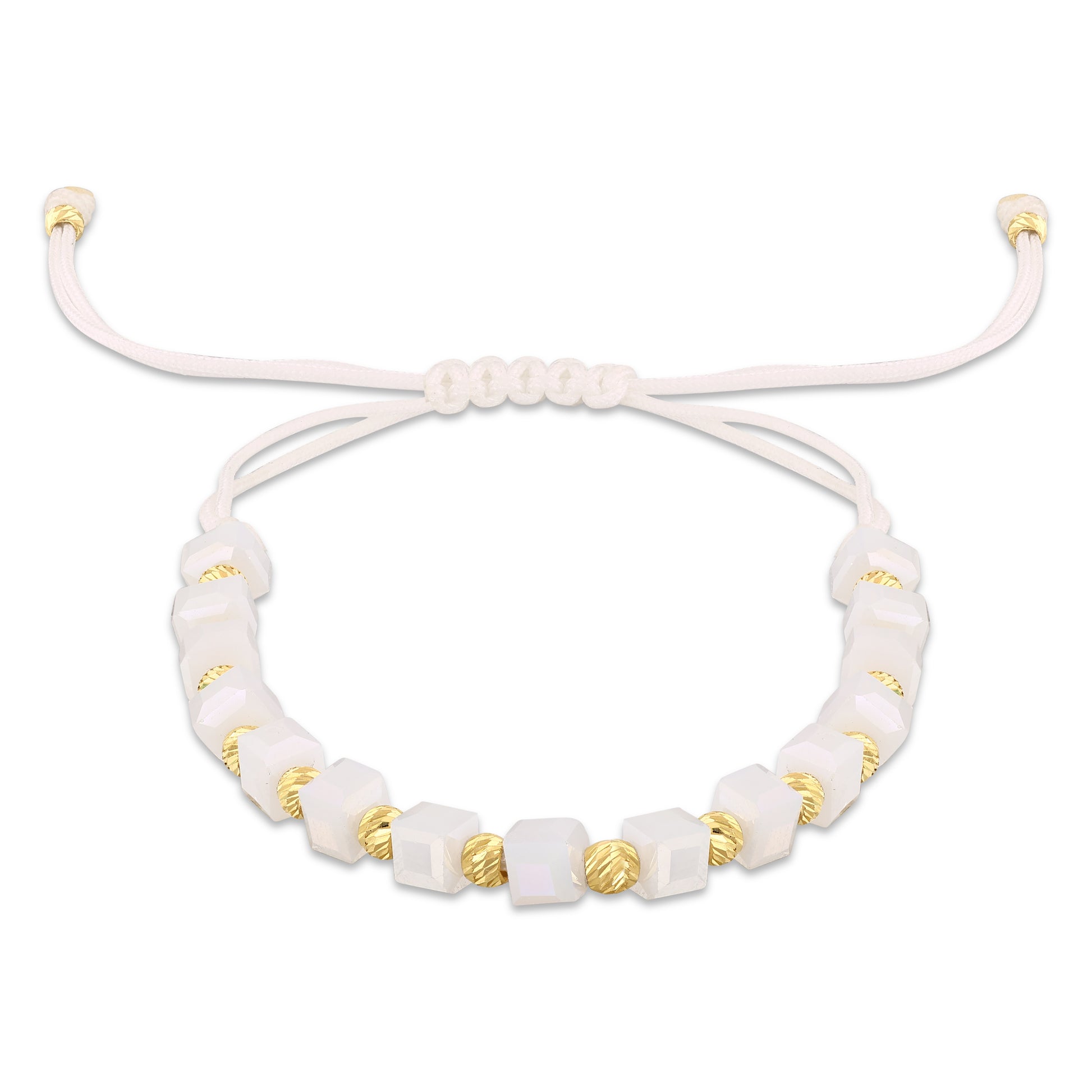 This unique bracelet, designed with white cube stones, is enriched with 14K gold Dorika beads and handwoven onto a durable double-stranded cord. Its adjustable structure allows the cord ends to be gently pulled for a comfortable and personalized fit on any wrist. The pure and timeless elegance of white meets golden accents to create a modern and powerful style.