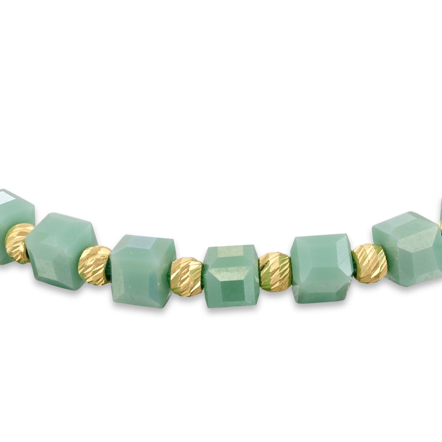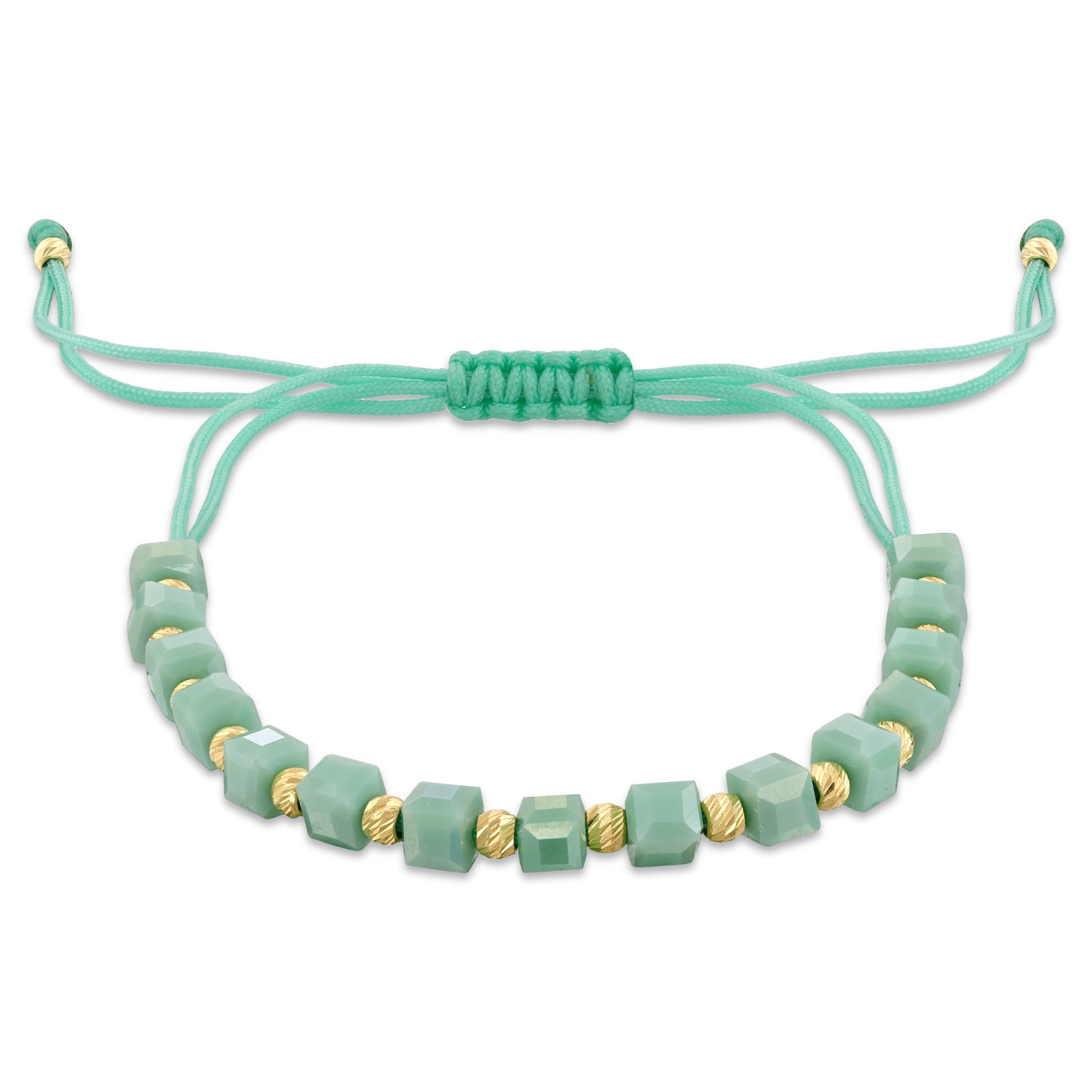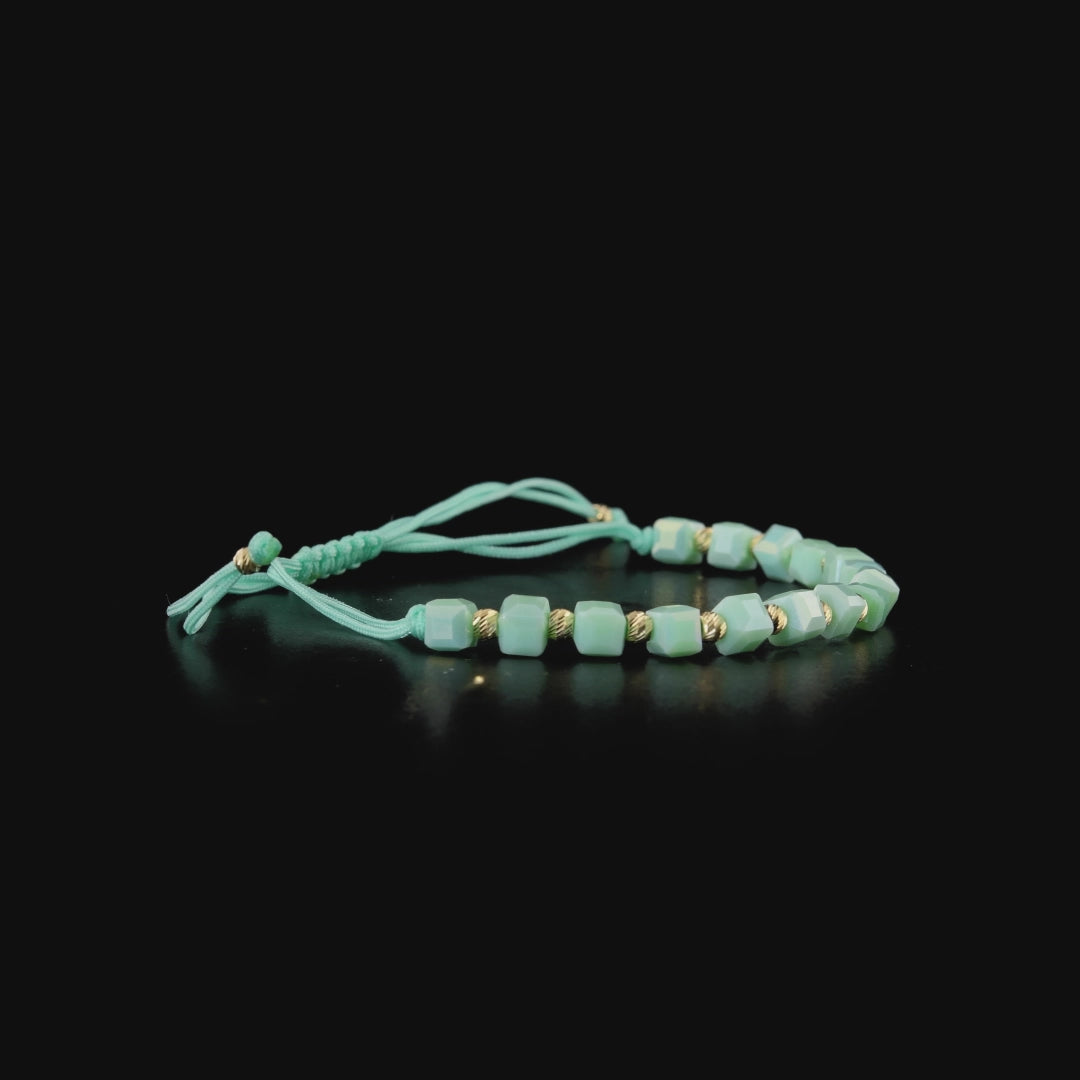 Pastel yeşil küp taşlarla tasarlanan bu özel bileklik, 14 ayar altın dorika toplarla zenginleştirilmiş ve çift katlı dayanıklı ipe el işçiliğiyle örülmüştür. Ayarlanabilir yapısı sayesinde ip uçları nazikçe çekilerek her bileğe kolayca uyum sağlar. Yumuşak pastel yeşil tonunun zarif dokusu, altın detaylarla buluşarak modern ve güçlü bir stil sunar.