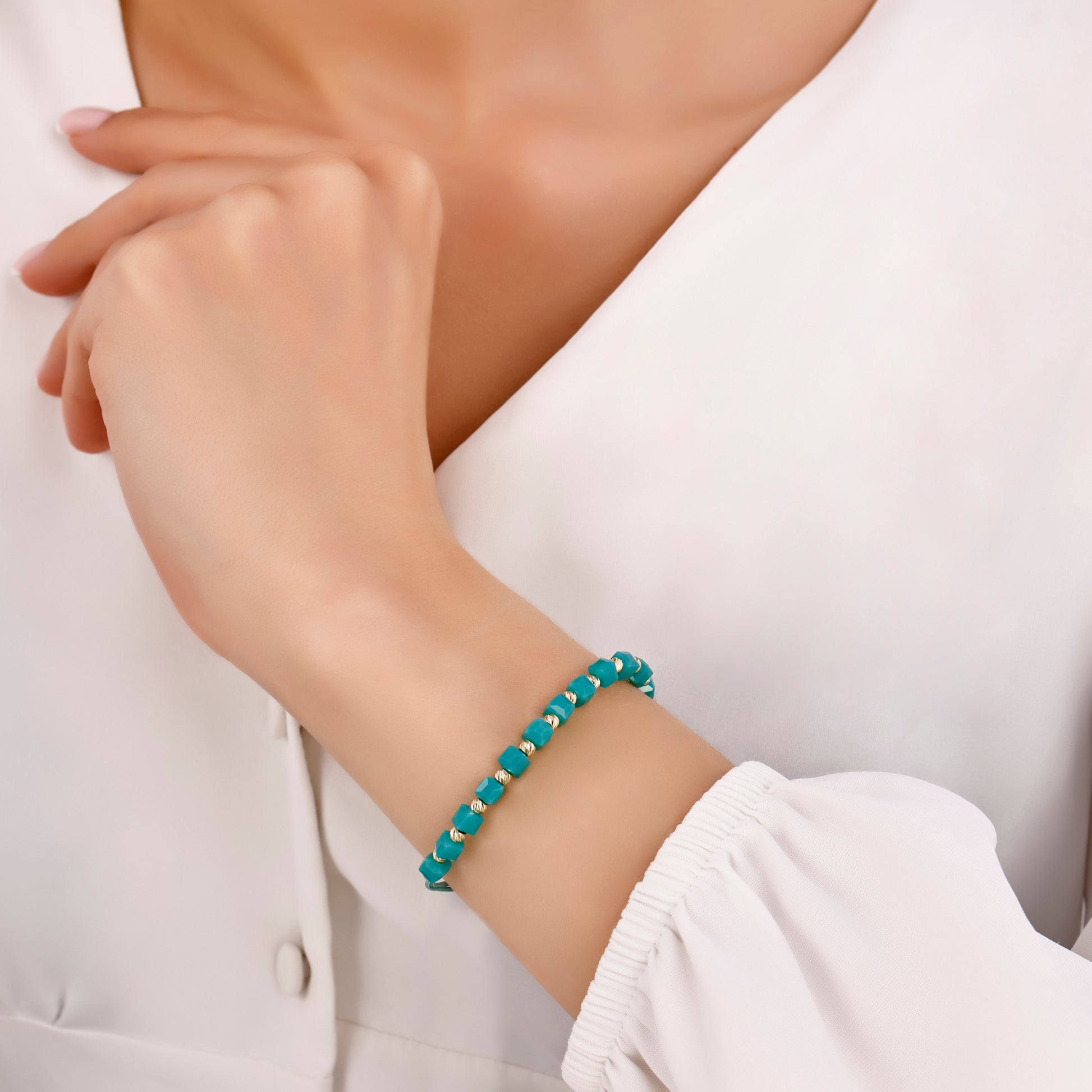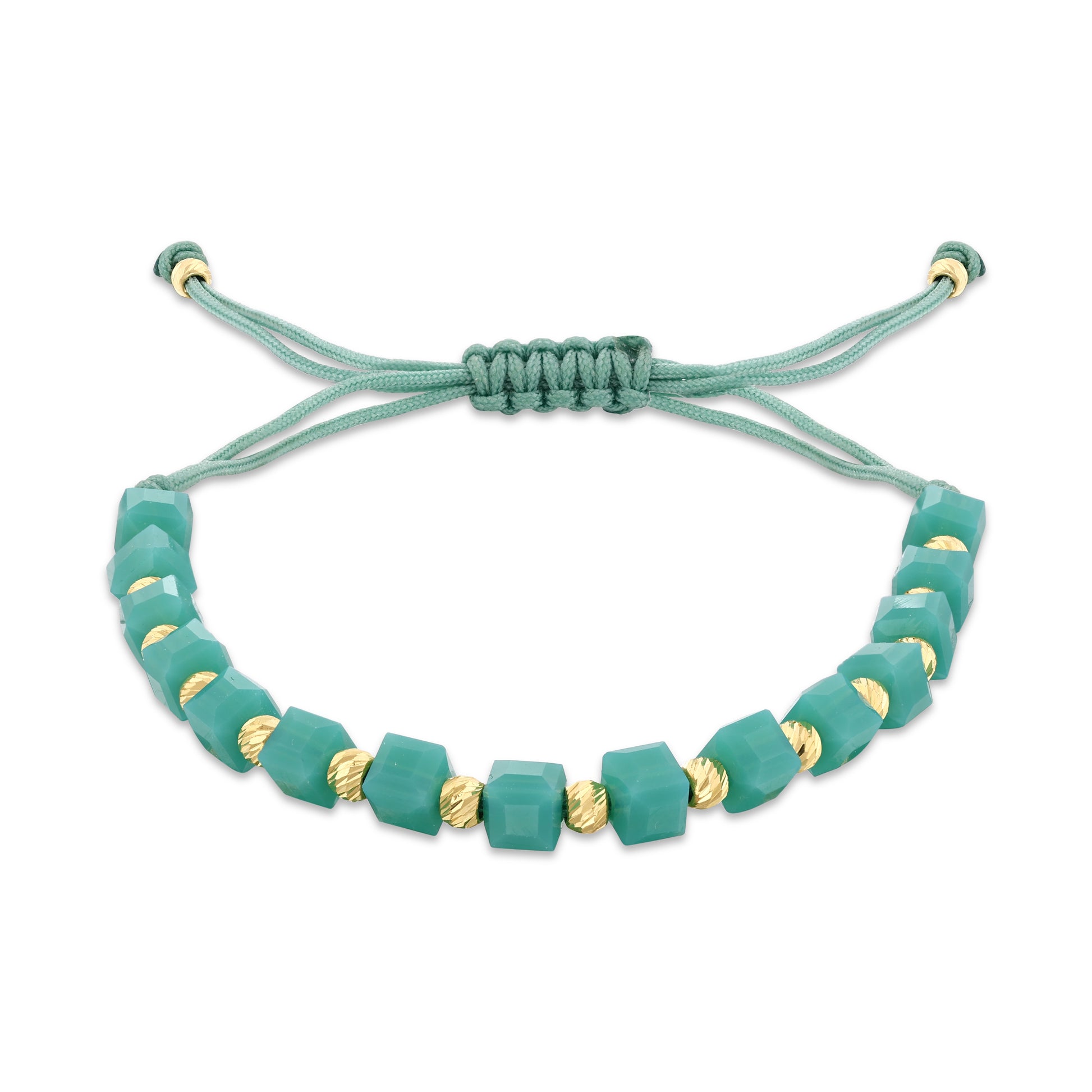 Turkuaz küp taşlarla tasarlanan bu özel bileklik, 14 ayar altın dorika toplarla zenginleştirilmiş ve çift katlı dayanıklı ipe el işçiliğiyle örülmüştür. Ayarlanabilir yapısı sayesinde ip uçları nazikçe çekilerek her bileğe kolayca uyum sağlar. Canlı turkuaz tonunun enerjisi, altın detaylarla buluşarak modern ve güçlü bir stil sunar.