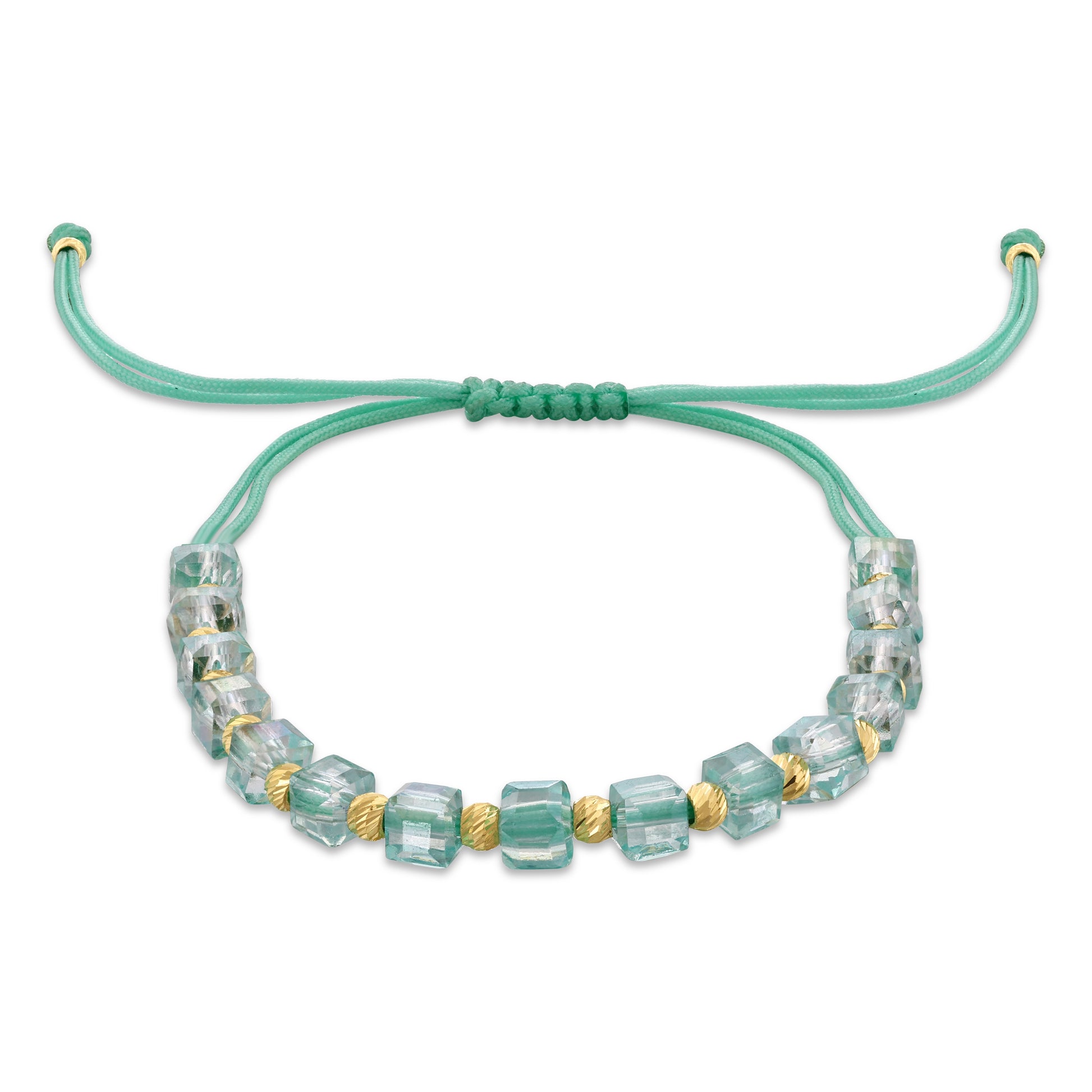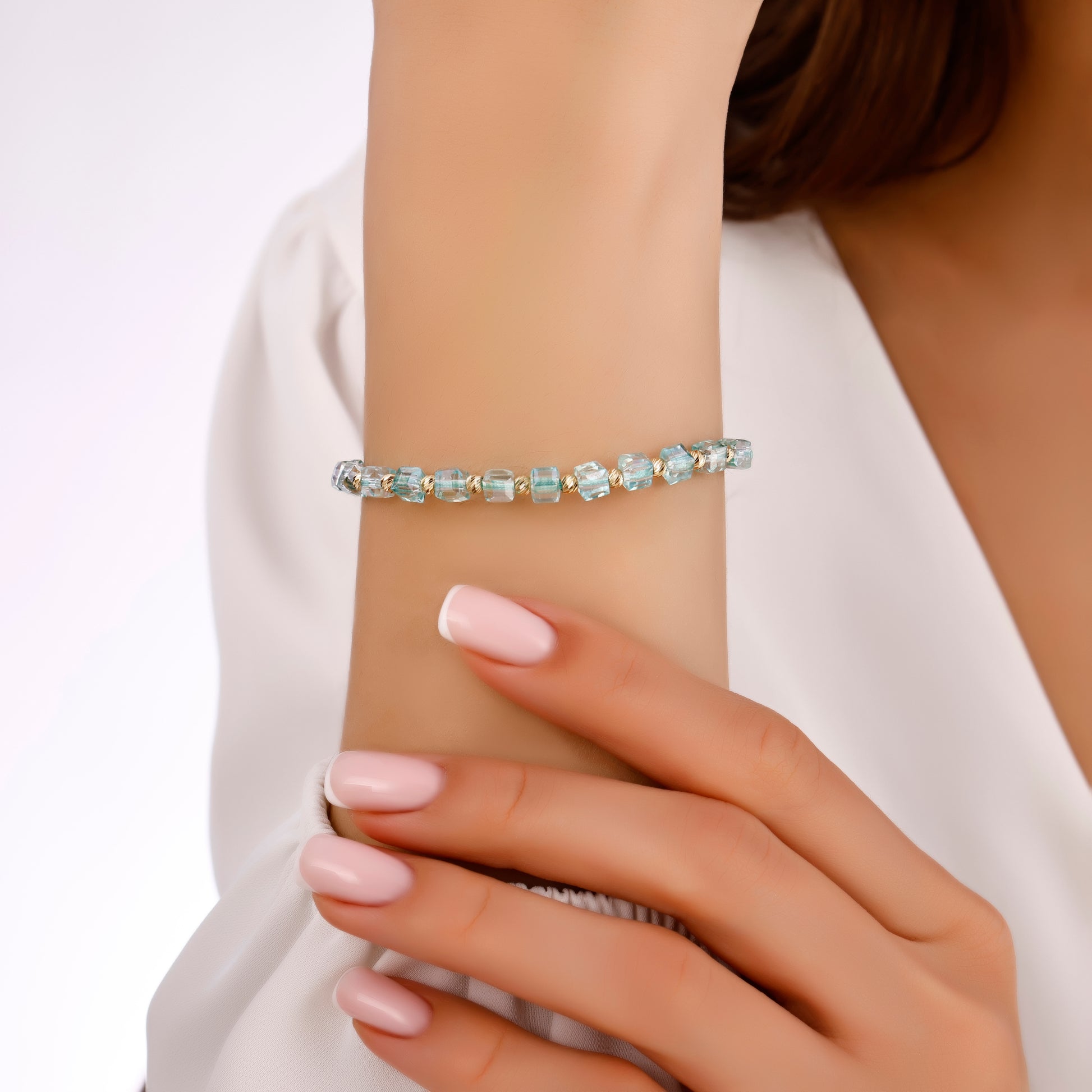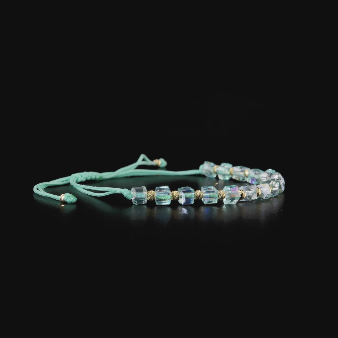Kristal buz turkuaz küp taşlarla tasarlanan bu özel bileklik, 14 ayar altın dorika toplarla zenginleştirilmiş ve çift katlı dayanıklı ipe el işçiliğiyle örülmüştür. Ayarlanabilir yapısı sayesinde ip uçları nazikçe çekilerek her bileğe kolayca uyum sağlar. Serin ve parlak turkuaz tonunun berrak ışıltısı, altın detaylarla buluşarak modern ve güçlü bir stil sunar.