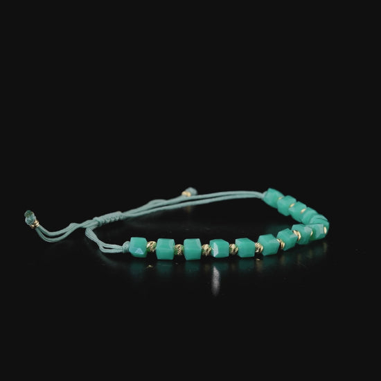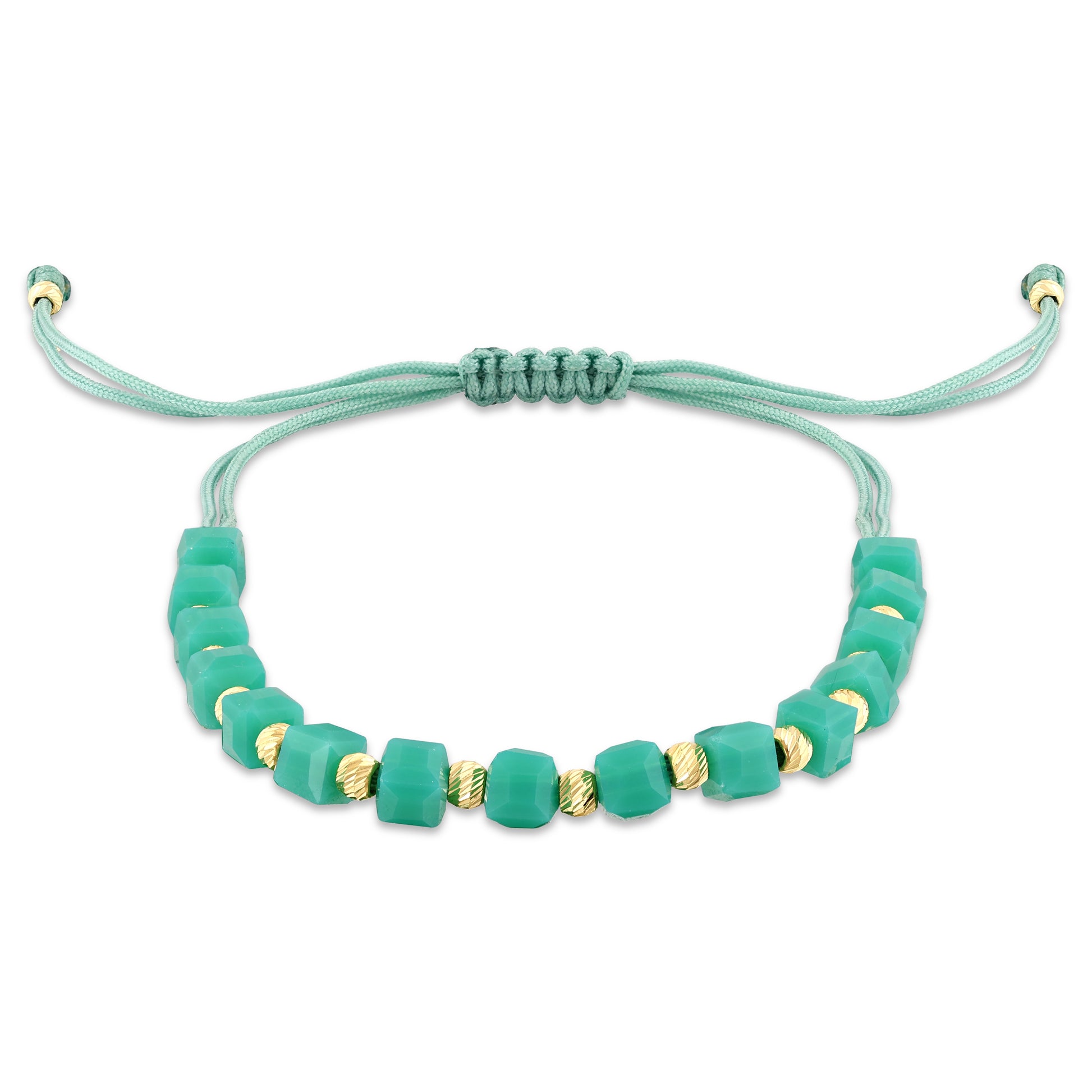 Karayip yeşili küp taşlarla tasarlanan bu özel bileklik, 14 ayar altın dorika toplarla zenginleştirilmiş ve çift katlı dayanıklı ipe el işçiliğiyle örülmüştür. Ayarlanabilir yapısı sayesinde ip uçları nazikçe çekilerek her bileğe kolayca uyum sağlar. Tropik Karayip tonunun canlı ve ferahlatıcı enerjisi, altın detaylarla buluşarak modern ve güçlü bir stil sunar.