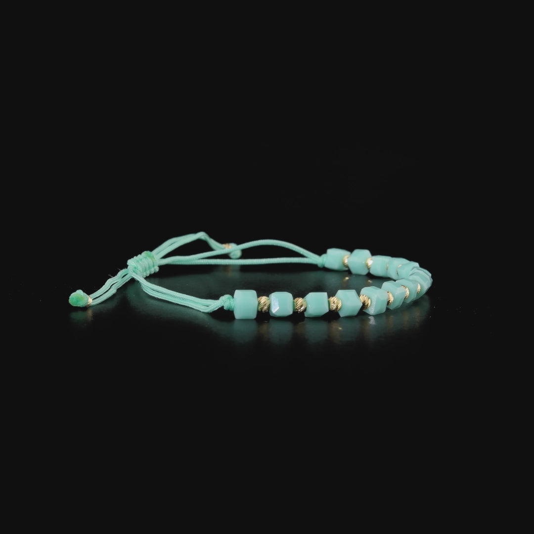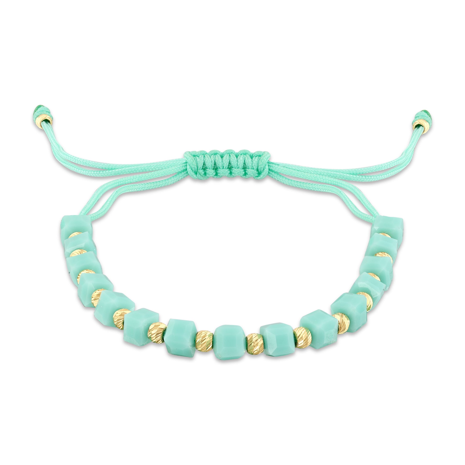 Buzlu turkuaz küp taşlarla tasarlanan bu özel bileklik, 14 ayar altın dorika toplarla zenginleştirilmiş ve çift katlı dayanıklı ipe el işçiliğiyle örülmüştür. Ayarlanabilir yapısı sayesinde ip uçları nazikçe çekilerek her bileğe kolayca uyum sağlar. Serin turkuaz tonunun donuk ışıltısı, altın detaylarla buluşarak modern ve güçlü bir stil sunar.