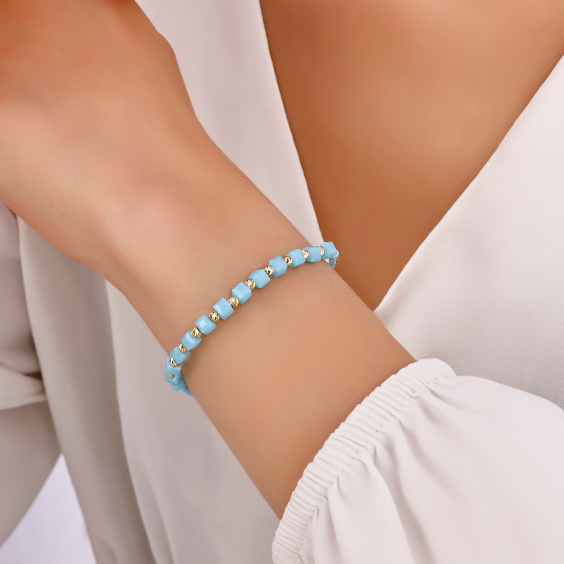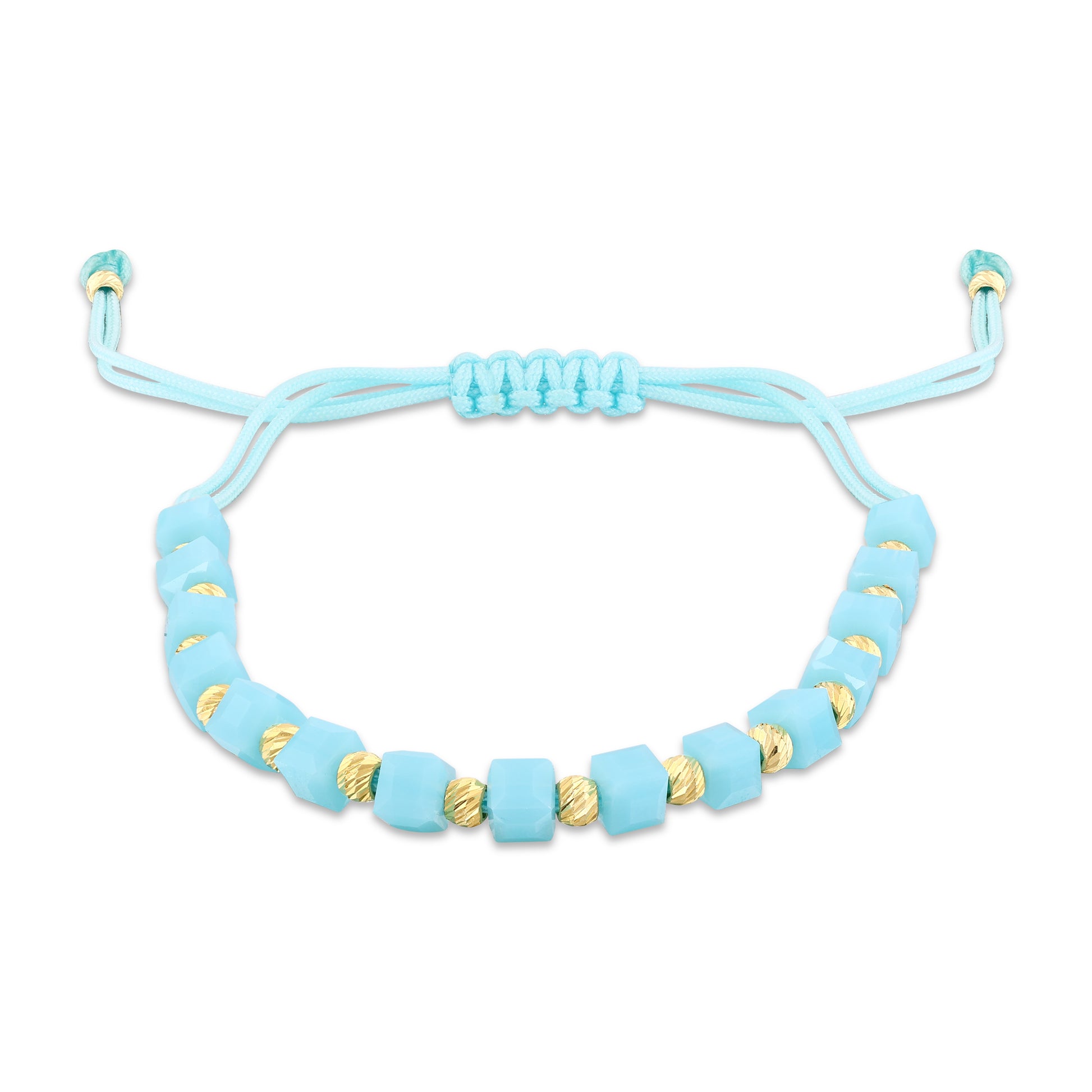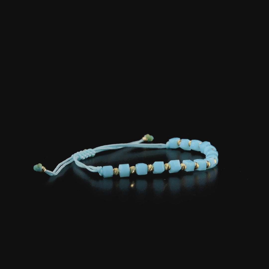 Buz mavisi küp taşlarla tasarlanan bu özel bileklik, 14 ayar altın dorika toplarla zenginleştirilmiş ve çift katlı dayanıklı ipe el işçiliğiyle örülmüştür. Ayarlanabilir yapısı sayesinde ip uçları nazikçe çekilerek her bileğe kolayca uyum sağlar. Serin ve sakin buz mavisi tonu, altın detaylarla buluşarak modern ve güçlü bir stil sunar.