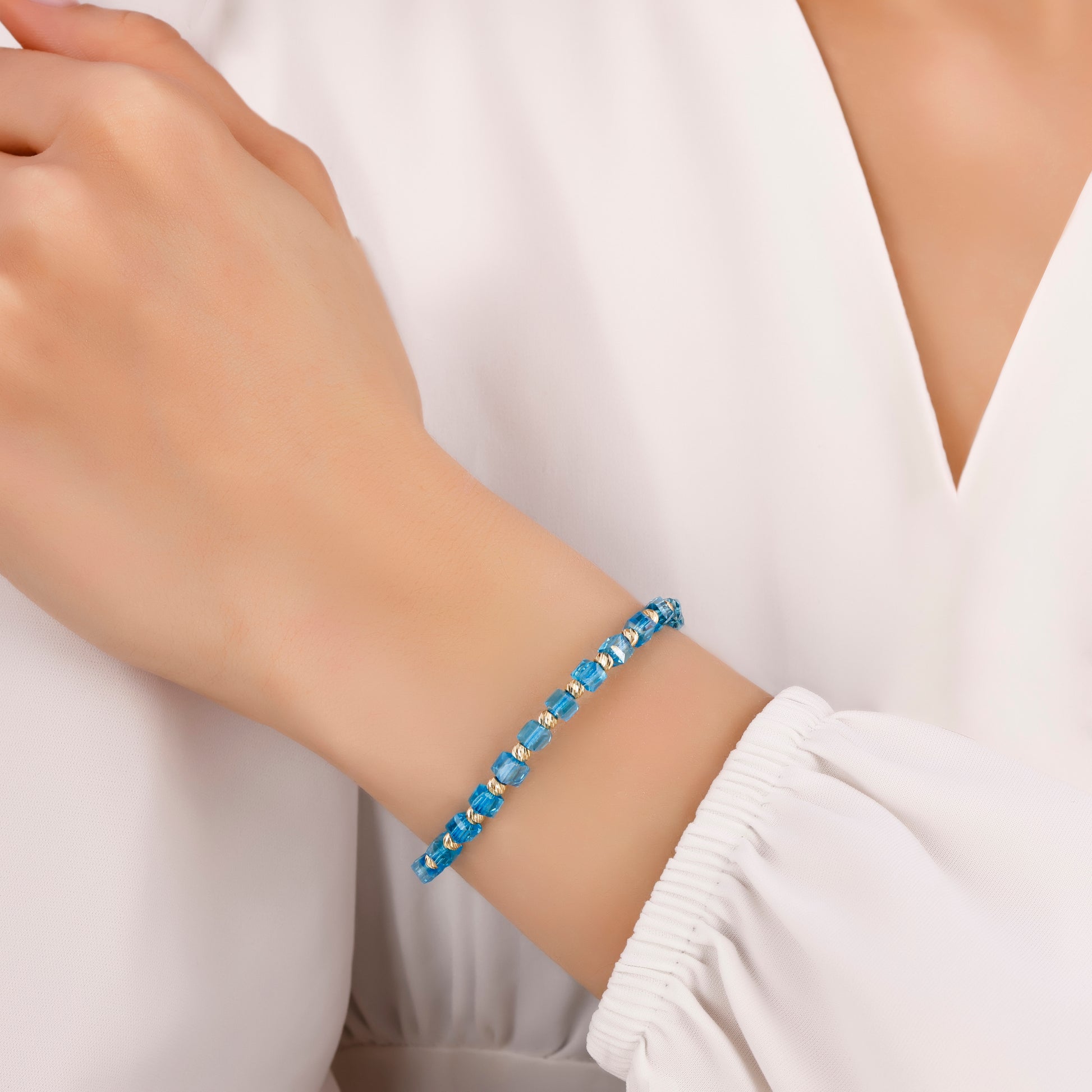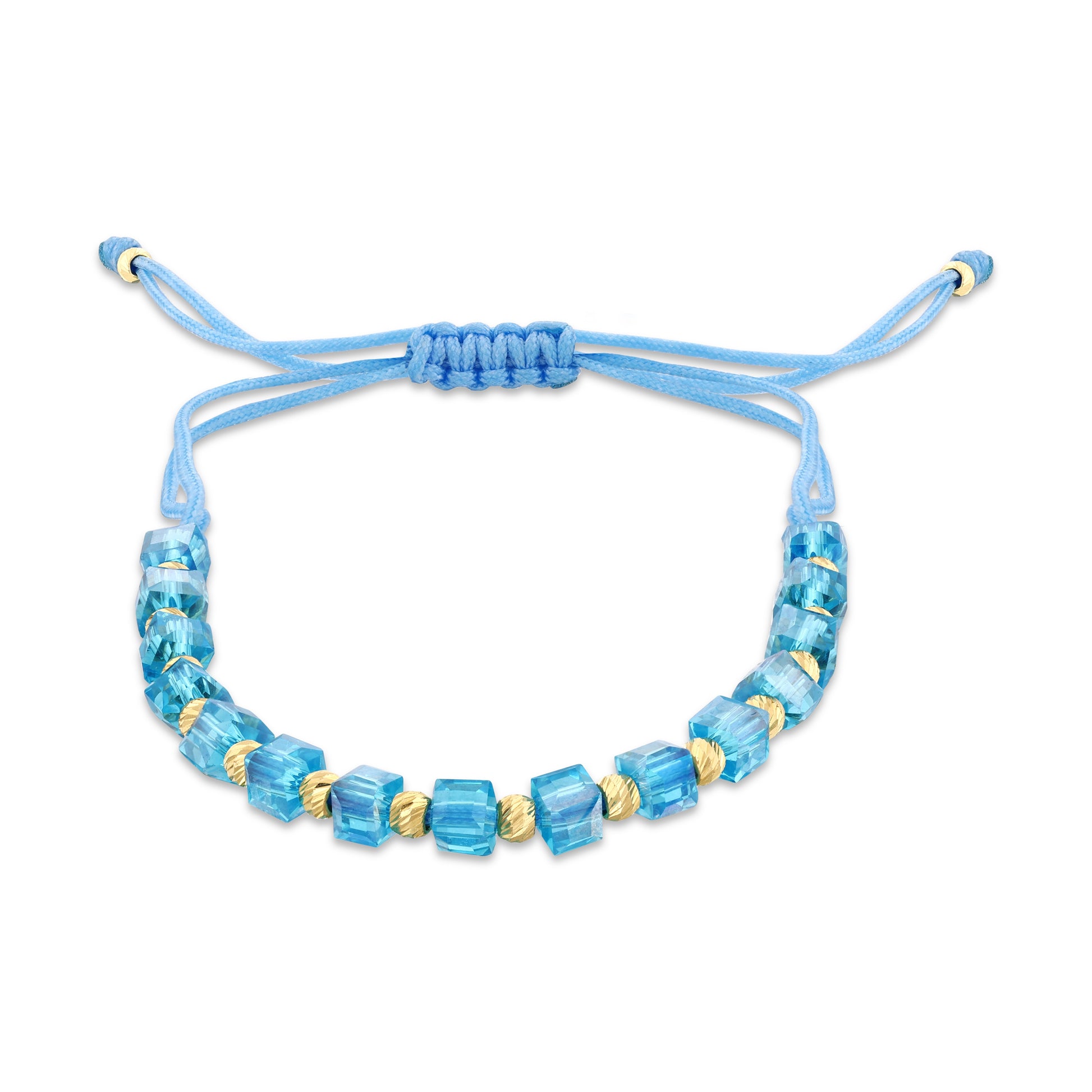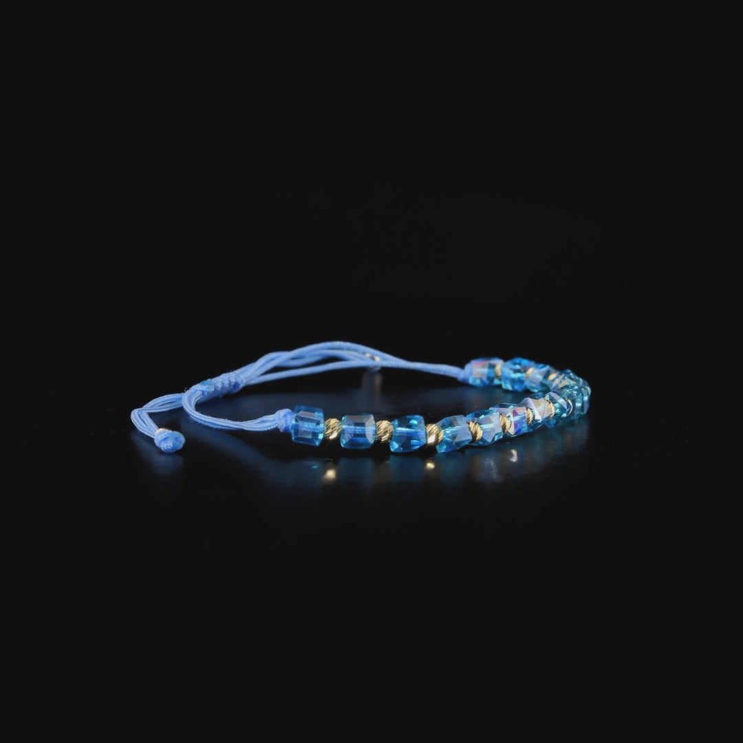 Kristal okyanus küp taşlarla tasarlanan bu özel bileklik, 14 ayar altın dorika toplarla zenginleştirilmiş ve çift katlı dayanıklı ipe el işçiliğiyle örülmüştür. Ayarlanabilir yapısı sayesinde ip uçları nazikçe çekilerek her bileğe kolayca uyum sağlar. Derin ve berrak okyanus tonunun serin ışıltısı, altın detaylarla buluşarak modern ve güçlü bir stil sunar.