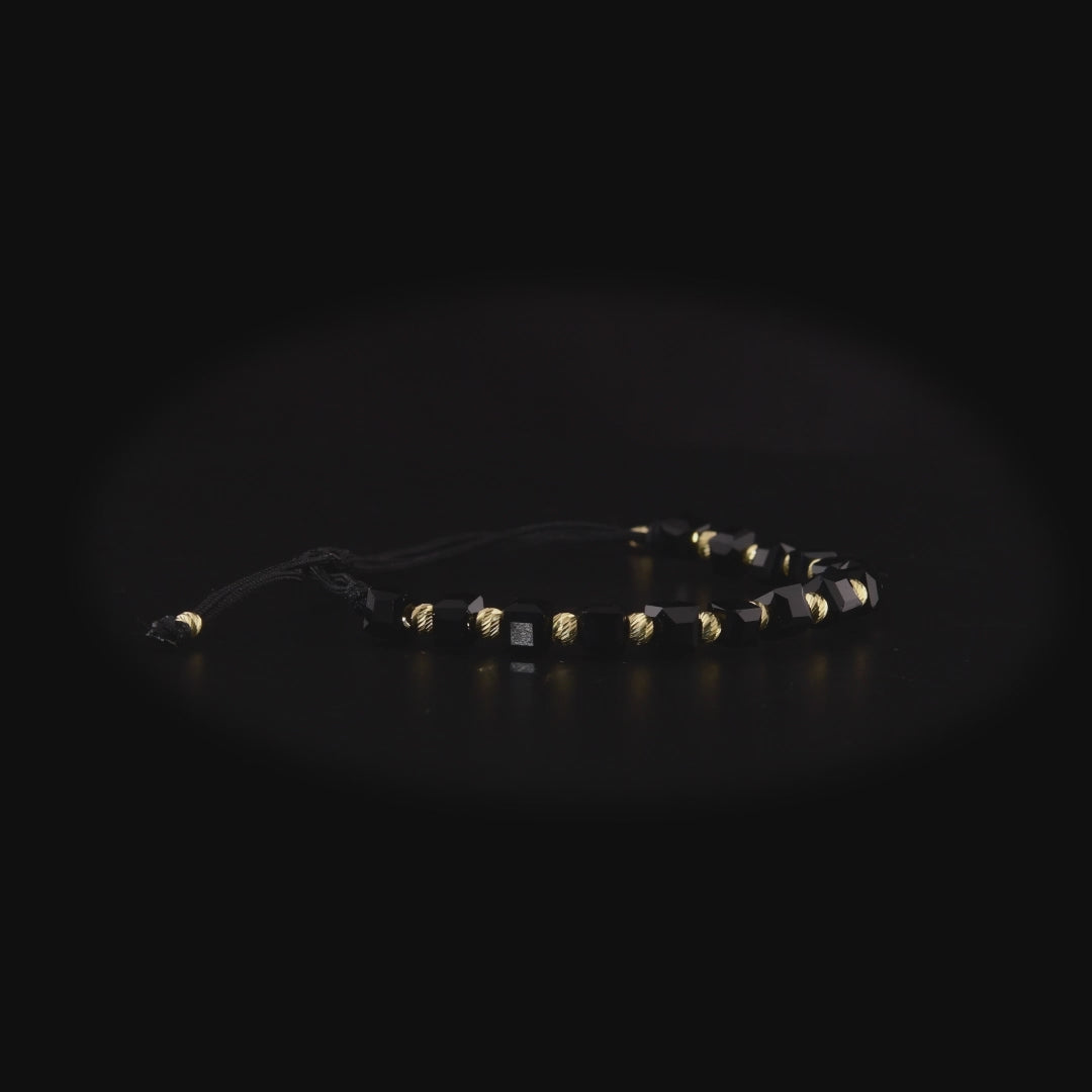 Siyah küp taşlarla tasarlanan bu özel bileklik, 14 ayar altın dorika toplarla zenginleştirilmiş ve çift katlı dayanıklı ipe el işçiliğiyle örülmüştür. Ayarlanabilir yapısı sayesinde ip uçları nazikçe çekilerek her bileğe kolayca uyum sağlar. Siyahın asaleti, altın detaylarla buluşarak modern ve güçlü bir stil sunar.