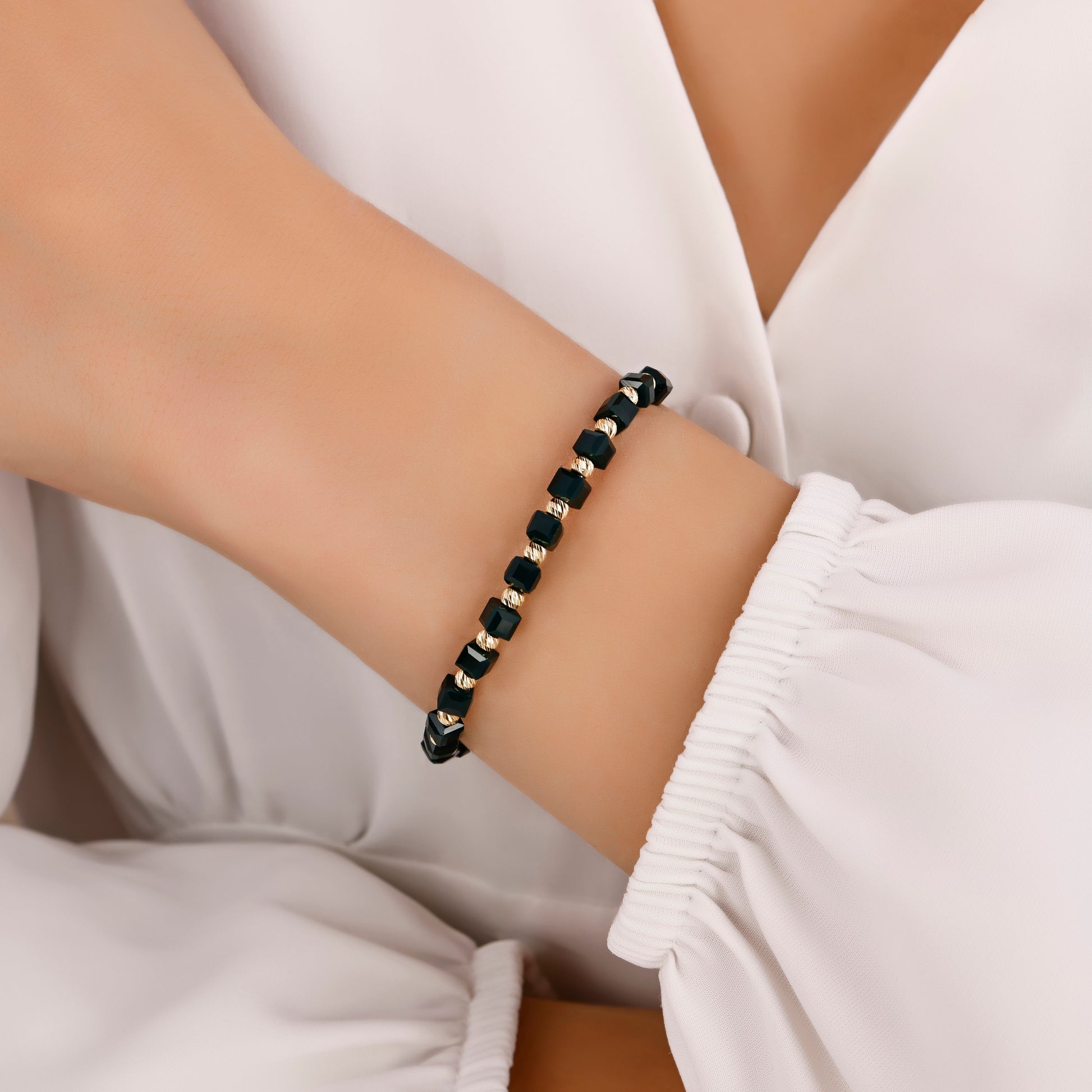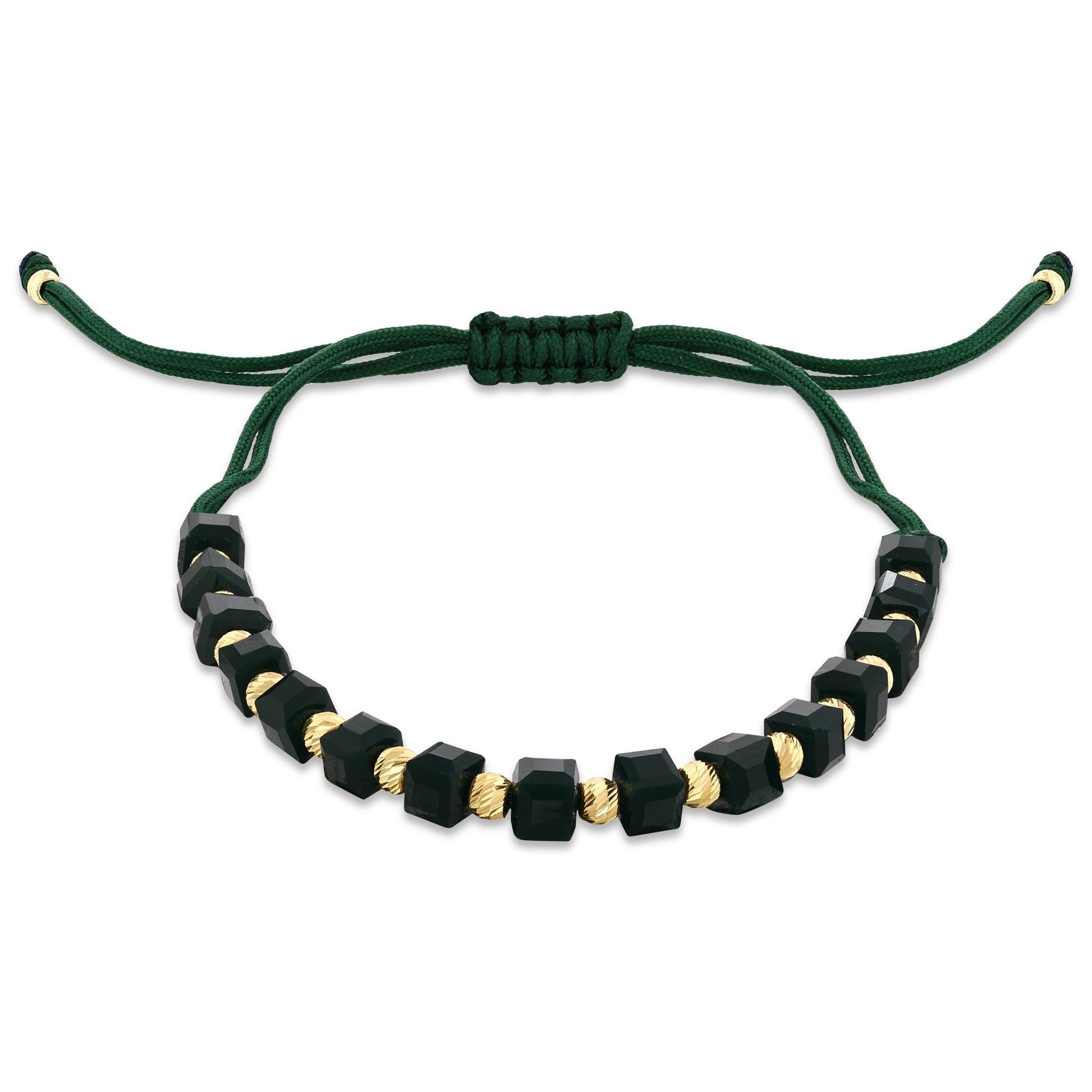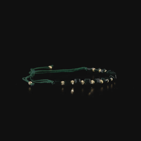 Koyu zümrüt yeşili küp taşlarla tasarlanan bu özel bileklik, 14 ayar altın dorika toplarla zenginleştirilmiş ve çift katlı dayanıklı ipe el işçiliğiyle örülmüştür. Ayarlanabilir yapısı sayesinde ip uçları nazikçe çekilerek her bileğe kolayca uyum sağlar. Derin yeşil tonun zarafeti, altın detaylarla buluşarak modern ve güçlü bir stil sunar.