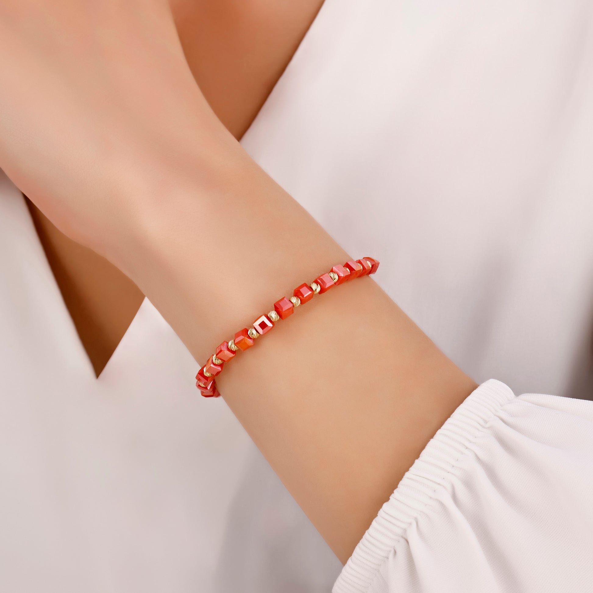 Gül mercanı tonlarındaki küp taşlarla tasarlanan bu özel bileklik, 14 ayar altın Dorika toplarla zenginleştirilmiş ve çift katlı dayanıklı ipe el işçiliğiyle örülmüştür. Ayarlanabilir yapısı sayesinde ip uçları nazikçe çekilerek her bileğe kolayca uyum sağlar. Gül mercanının yumuşak ve romantik tonu, altın detaylarla buluşarak modern, zarif ve kendiliğinden şık bir stil sunar.