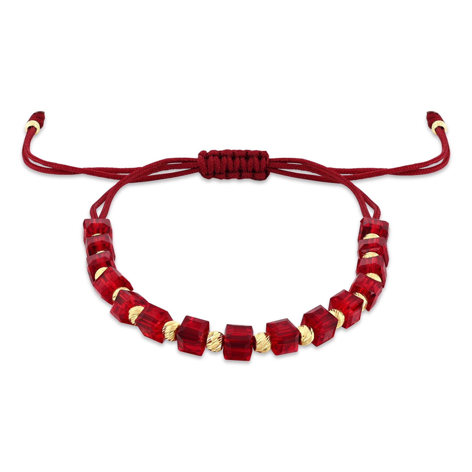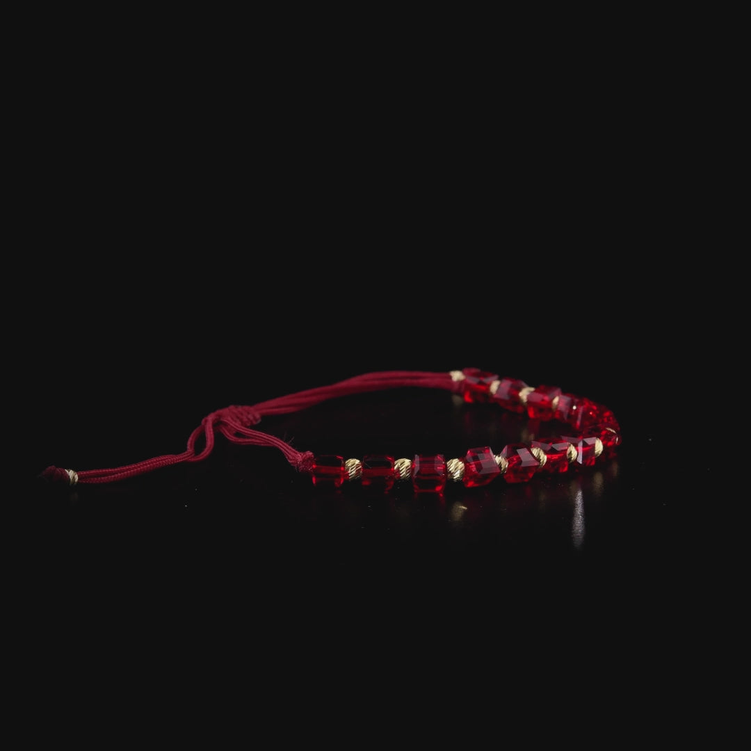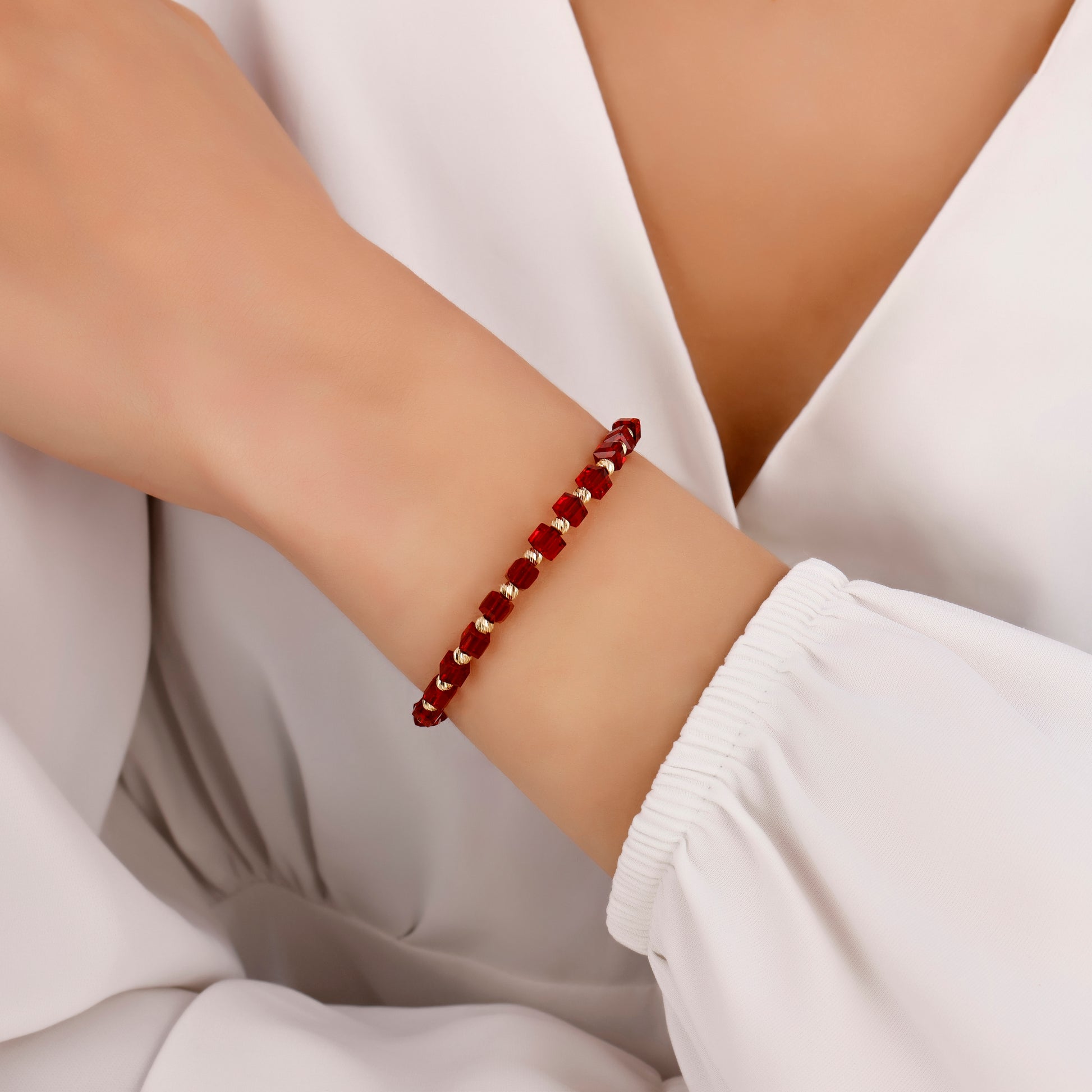 Kristal kırmızı küp taşlarla tasarlanan bu özel bileklik, 14 ayar altın Dorika toplarla zenginleştirilmiş ve çift katlı dayanıklı ipe el işçiliğiyle örülmüştür. Ayarlanabilir yapısı sayesinde ip uçları nazikçe çekilerek her bileğe kolayca uyum sağlar. Cesur ve ışıltılı kristal kırmızı ton, altın detaylarla buluşarak modern ve güçlü bir stil sunar.