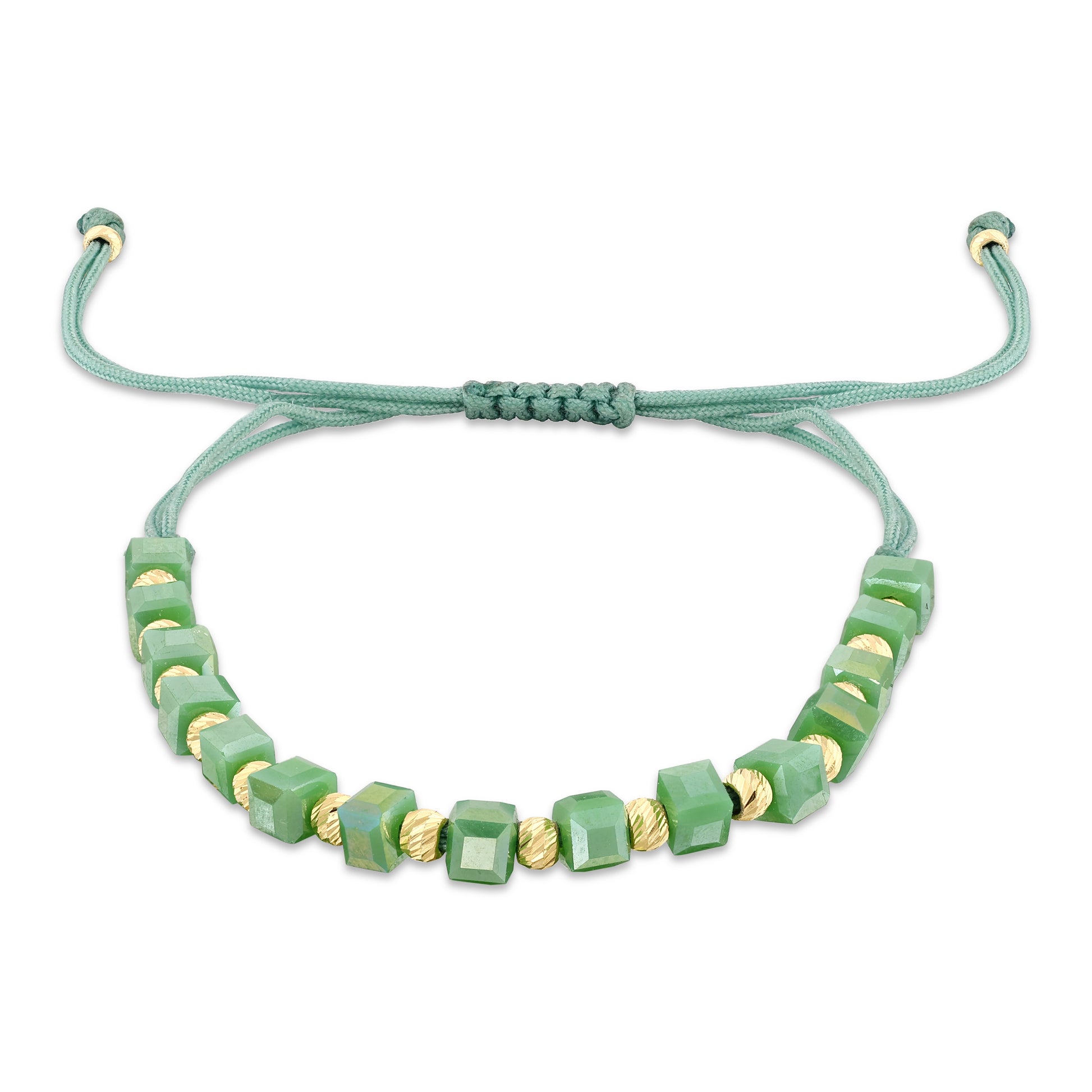 Nane yeşili küp taşlarla tasarlanan bu özel bileklik, 14 ayar altın dorika toplarla zenginleştirilmiş ve çift katlı dayanıklı ipe el işçiliğiyle örülmüştür. Ayarlanabilir yapısı sayesinde ip uçları nazikçe çekilerek her bileğe kolayca uyum sağlar. Ferahlatıcı nane tonunun canlılığı, altın detaylarla buluşarak modern ve güçlü bir stil sunar.
